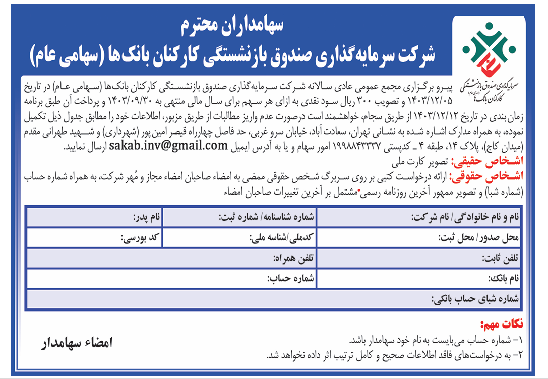 اخبار شرکت 24 مهر 1404 sakab پست قبلی مجمع عمومی عادی سالیانه سرمایه گذاری صندوق بازنشستگی کارکنان بانک ها