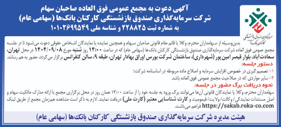 آگهی دعوت به مجمع عمومی فوق العاده صاحبان سهام شرکت سرمایه گذاری صندوق بازنشستگی کارکنان بانکها (سهامی عام)
